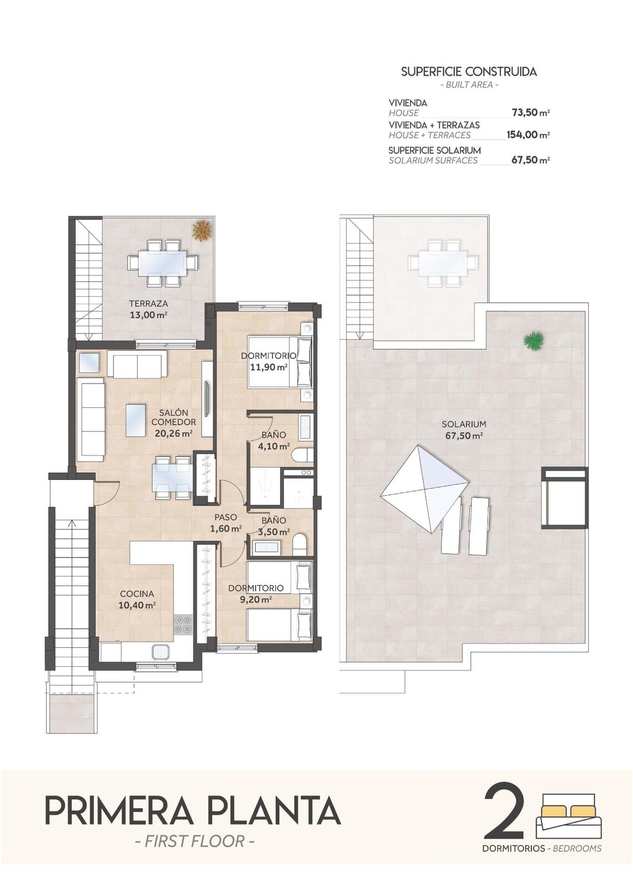 New Build Bungalows in San Miguel de Salinas – Nature, Golf and Comfort Discover this new residential development in San Miguel de Salinas, located in the sought-after area of “La Cañada”, surrounded by a protected pine forest between the prestigious golf courses of Campoamor and Las Colinas. Just 7 km from the Mediterranean coast, this residential offers the perfect blend of tranquility, nature, and easy access to all amenities. Spacious and Modern Homes The development offers two property types to suit different lifestyles: Ground floor bungalows: 2 bedrooms, 2 bathrooms, two large private gardens, and surface parking. Top floor bungalows: 2 bedrooms, 2 bathrooms, spacious solarium with sea views, and surface parking. Each home features generous dimensions and can be adapted into a 3-bedroom layout (optional at an extra cost), with kitchen appliances included. High-Quality Finishes Designed for comfort and functionality, all properties include: Fully equipped bathrooms with furniture, mirrors, and shower screens Aerothermal hot water system Built-in LED ceiling lights Exclusive Community Areas The residential features over 1,700 m2 of landscaped green areas with palm trees and Mediterranean plants. Residents can enjoy a large swimming pool with jacuzzi, a children’s pool, and sunbathing areas, making it the ideal setting to enjoy the Costa Blanca climate all year round. Privileged Location in San Miguel de Salinas This quiet residential is located less than 3 km from the charming town of San Miguel de Salinas, with all daily services at hand. In addition, beautiful sandy beaches in Orihuela Costa and Torrevieja are only 7 km away, offering endless leisure, shopping, and dining options. Close to Renowned Golf Courses For golf enthusiasts, the location is unbeatable. Within a 4 km radius you will find three of the most prestigious golf courses on the Costa Blanca: Villamartín Golf – 3.5 km Las Colinas Golf & Country Club – 4 km Campoamor Golf – 4 km Excellent Connectivity Key points of interest nearby include: San Miguel de Salinas – 3 km La Zenia Boulevard Shopping Centre – 10 km Alicante Airport – 55 km Murcia Airport (Corvera) – 50 km Secure Your New Home in San Miguel de Salinas Whether you are looking for a permanent residence, a holiday retreat, or an investment opportunity, these new build bungalows offer excellent value in one of the most desirable areas of the Costa Blanca. Contact us today for more information and to arrange a visit.
